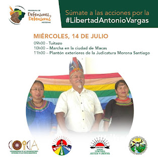 A la fecha se cumplen 24 días de detención arbitraria y más de 2 años de falta de justicia para Antonio, lo que evidencia la persecución política contra este líder histórico quien a lo largo de su trayectoria ha afrontado más de 30 juicios en su contra por el solo hecho de defender los derechos humanos de los pueblos indígenas y a quien, el 20 de junio pasado, se le trasladó hasta el Centro de Rehabilitación Social de Macas vía helicóptero de las Fuerzas Armadas del Gobierno ecuatoriano tras una detención arbitraria e ilegal, cuyo uso fue destinado exclusivamente para concretar su encierro, estratégicamente, días antes del desarrollo