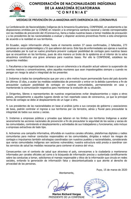a las disposiciones emitidas por la CONAIE en relación a la emergencia