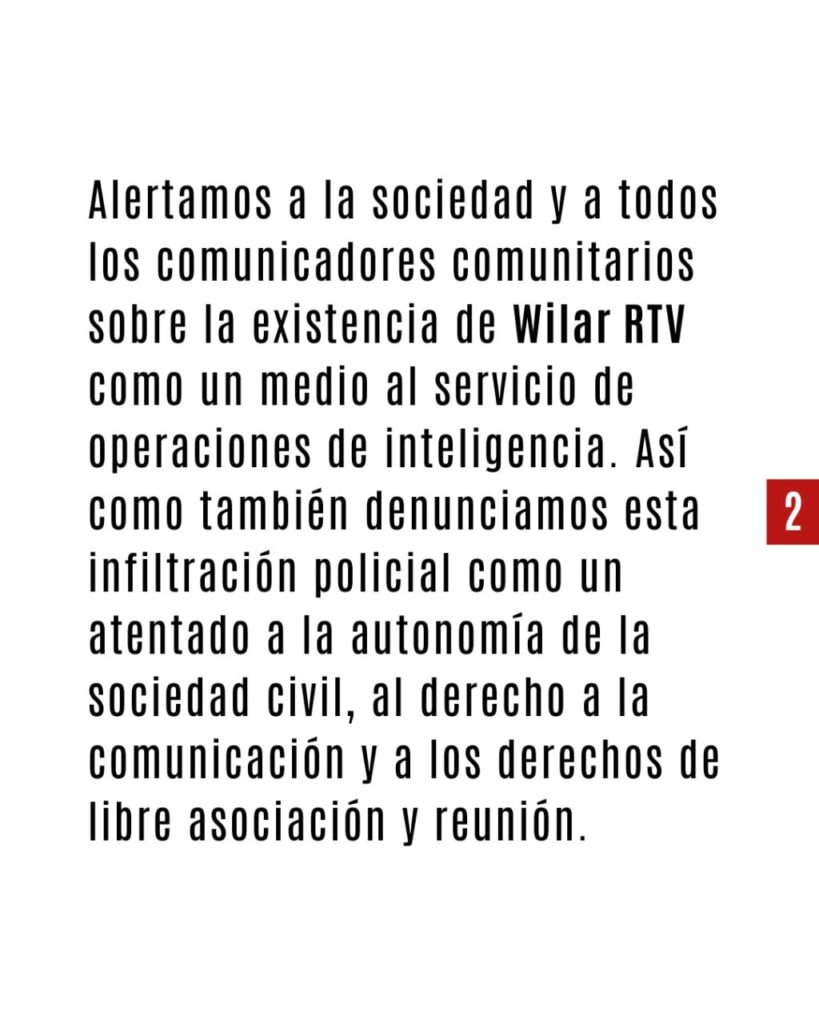 Alertamos a la sociedad y a todos los comunicadores comunitarios sobre la existencia de Wilar RTV como un medio al servicio de operaciones de inteligencia. Así como también denunciamos esta infiltración policial como un atentado a la autonomía de la sociedad civil, al derecho a la comunicación y a los derechos de libre asociación y reunión.