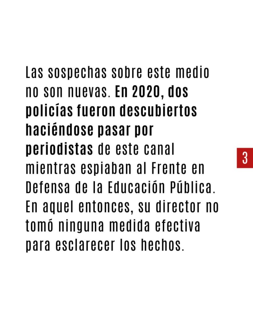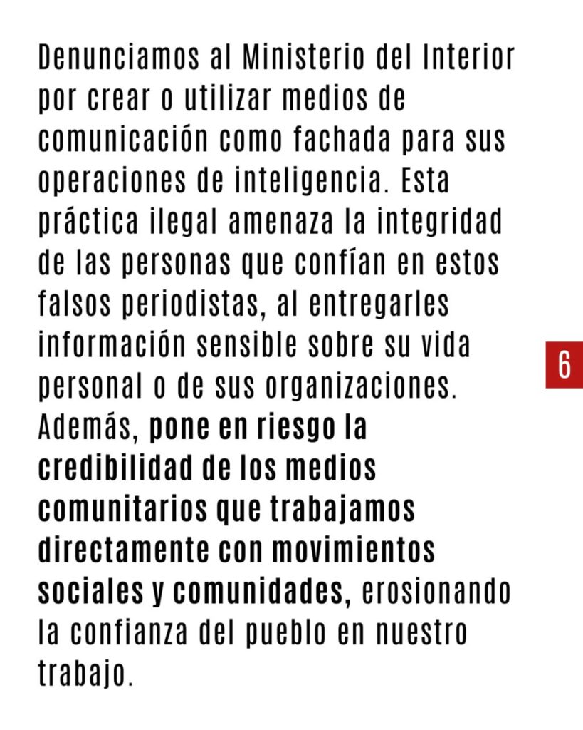Denunciamos al Ministerio del Interior por crear o utilizar medios de comunicación como fachada para sus operaciones de inteligencia. Esta práctica ilegal amenaza la integridad de las personas que confían en estos falsos periodistas, al entregarles información sensible sobre su vida personal o de sus organizaciones. Además, pone en riesgo la credibilidad de los medios comunitarios que trabajamos directamente con movimientos sociales y comunidades, erosionando la confianza del pueblo en nuestro trabajo.