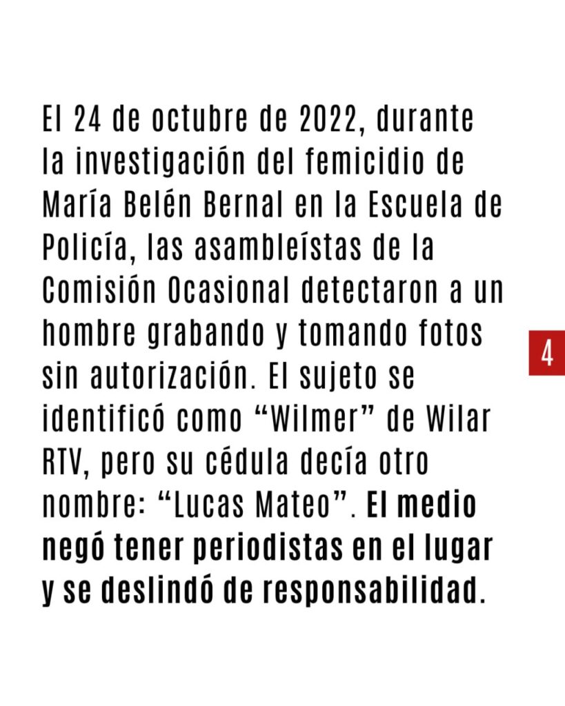 Las sospechas sobre este medio no son nuevas. En 2020, dos policías fueron descubiertos haciéndose pasar por periodistas de este canal mientras espiaban al Frente en Defensa de la Educación Pública. En aquel entonces, su director no tomó ninguna medida efectiva para esclarecer los hechos. El 24 de octubre de 2022, durante la investigación del femicidio de María Belén Bernal en la Escuela de Policía, las asambleístas de la Comisión Ocasional detectaron a un hombre grabando y tomando fotos sin autorización. El sujeto se identificó como “Wilmer” de Wilar RTV, pero su cédula decía otro nombre: “Lucas Mateo”. El medio negó tener periodistas en el lugar y se deslindó de responsabilidad.