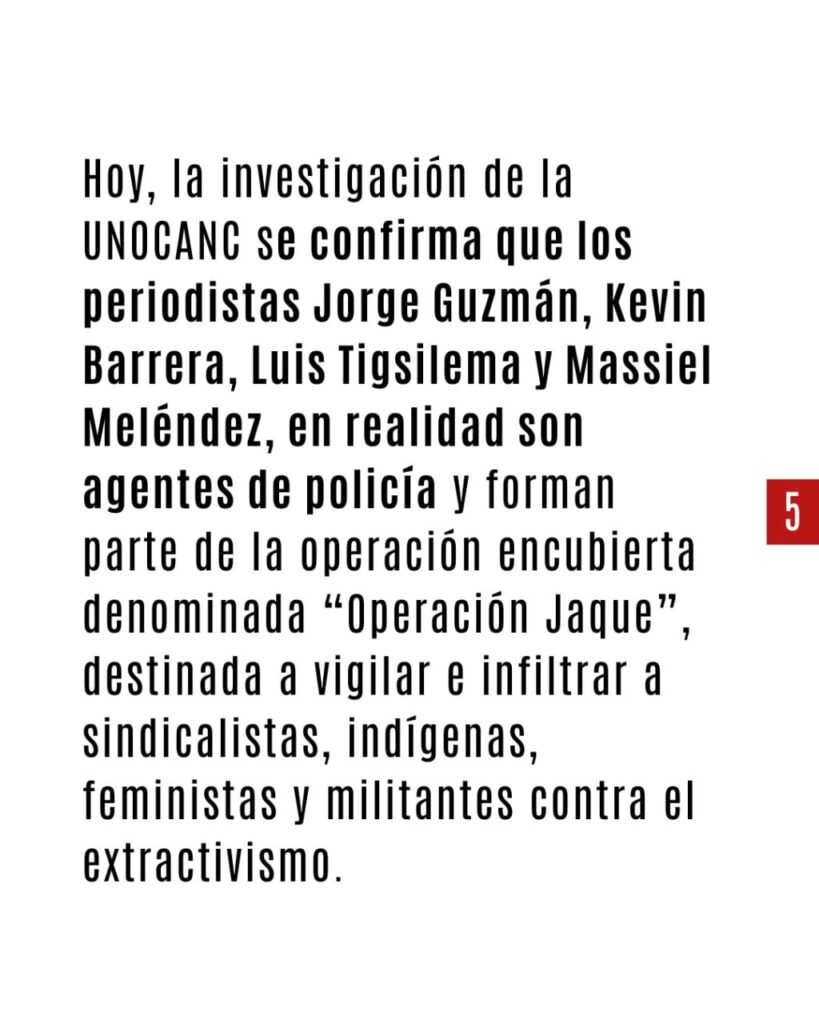 Hoy, la investigación de la UNOCANC se confirma que los periodistas Jorge Guzmán, Kevin Barrera, Luis Tigsilema y Massiel Meléndez, en realidad son agentes de policía y forman parte de la operación encubierta denominada “Operación Jaque”, destinada a vigilar e infiltrar a sindicalistas, indígenas, feministas y militantes contra el extractivismo.