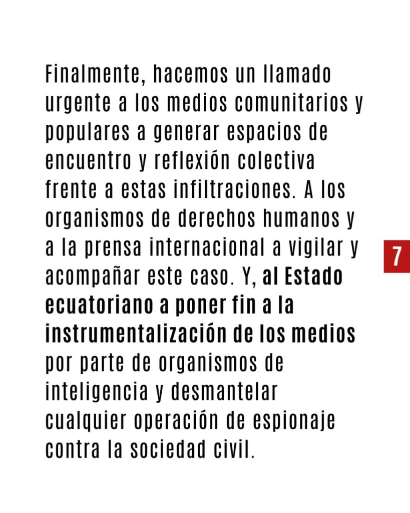 Finalmente, hacemos un llamado urgente a los medios comunitarios y populares a generar espacios de encuentro y reflexión colectiva frente a estas infiltraciones. A los organismos de derechos humanos y a la prensa internacional a vigilar y acompañar este caso. Y, al Estado ecuatoriano a poner fin a la instrumentalización de los medios por parte de organismos de inteligencia y desmantelar cualquier operación de espionaje contra la sociedad civil.